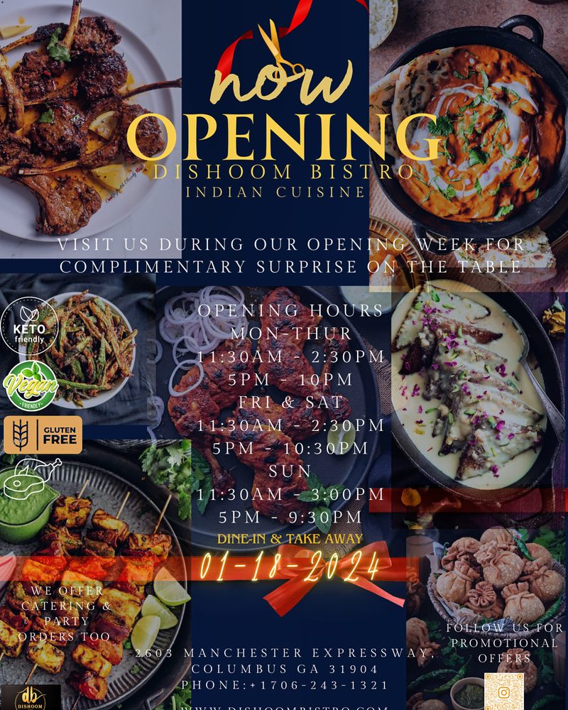 Welcome to Dishoom Bistro, a delightful fusion of traditional and contemporary Indian cuisine located at 2603 Manchester Expy, Columbus, GA. Offering a vibrant atmosphere, this restaurant captures the essence of Indian culture with an elegant touch. Discover a diverse menu featuring classic entrees like Chicken Tikka Masala and Lamb Chettinad, alongside innovative dishes such as Seafood Basil Curry and Duck Leg Korma.